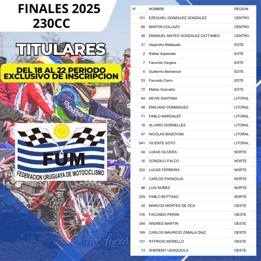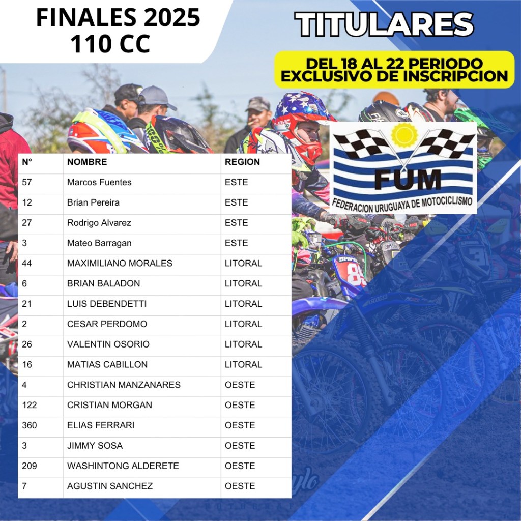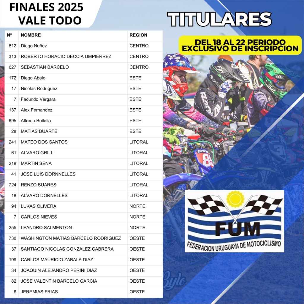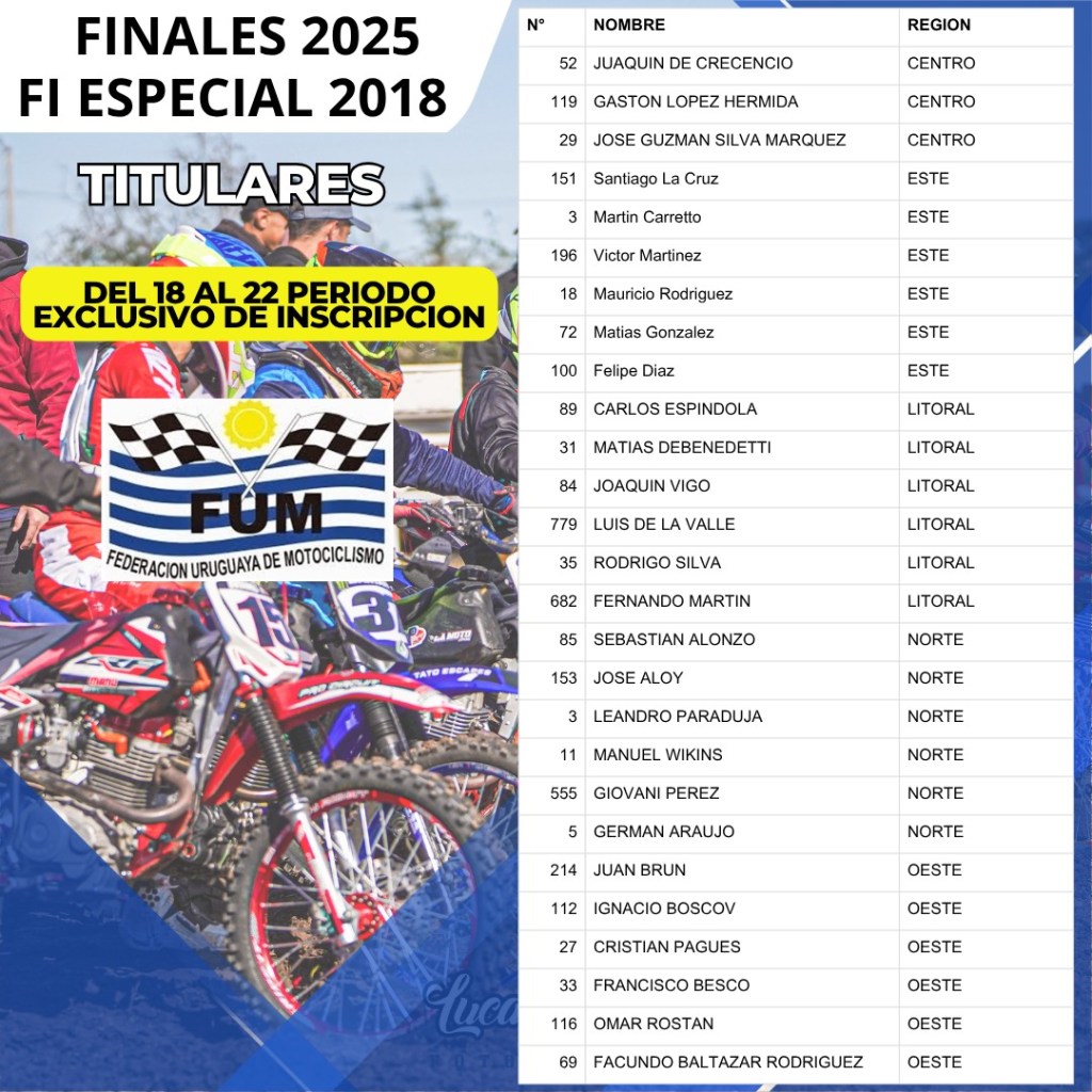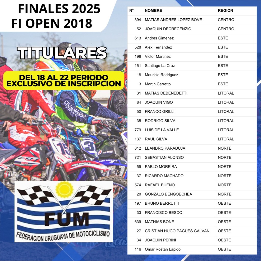Los pilotos titulares son los seis primeros de los campeonatos de las 12 categorías en los cinco regionales del país: Suroeste, Sureste, Centro, Litoral y Norte. En las Finales Nacionales, ellos tiene prioridad a la hora de inscribirse, ya que se abre un período exclusivo que va del 18 al 22 de noviembre. Luego, lo pueden hacer del 23 al 26 de ese mes, pero junto con los suplentes.
