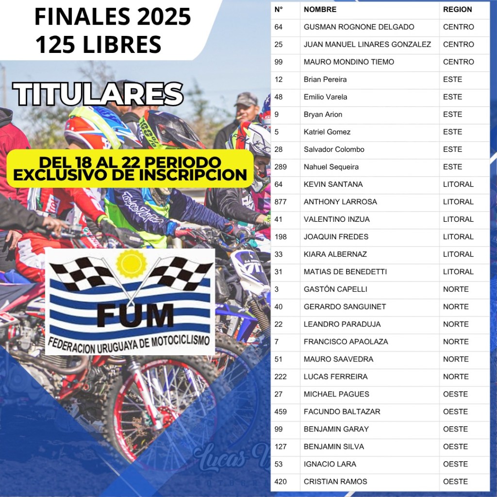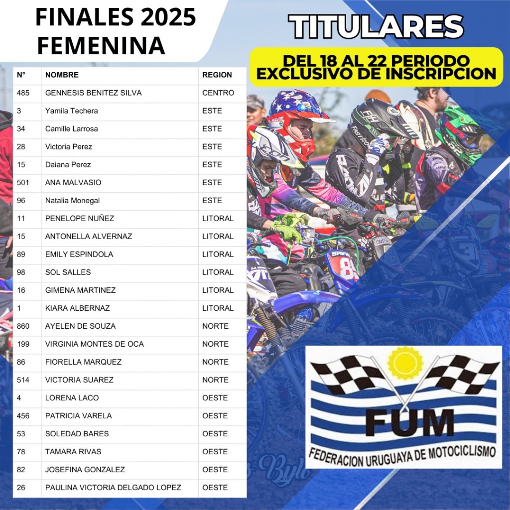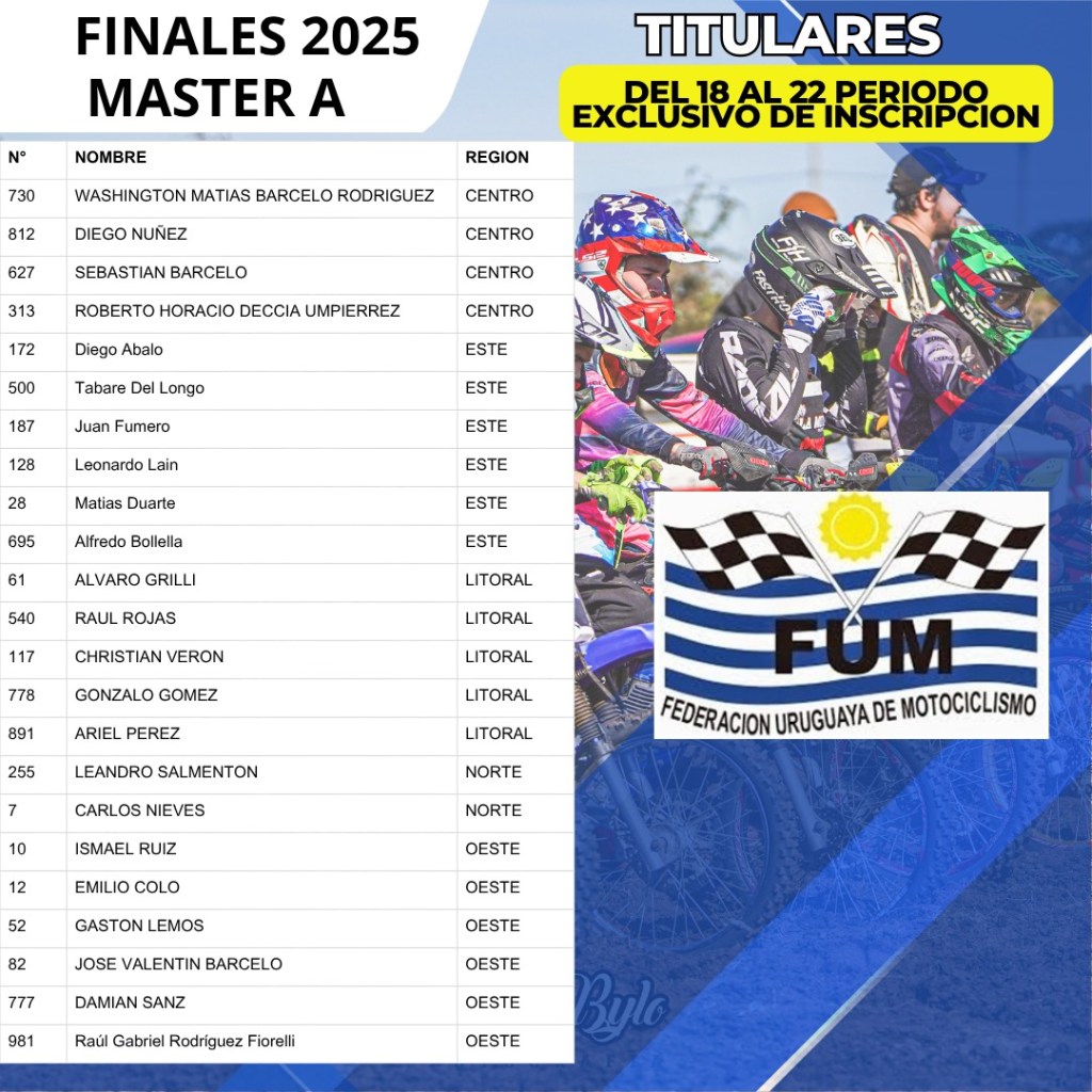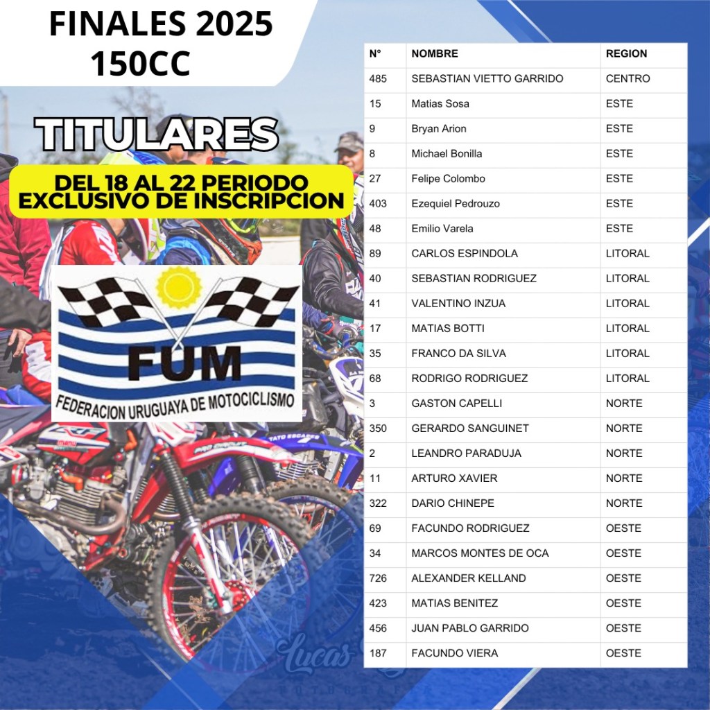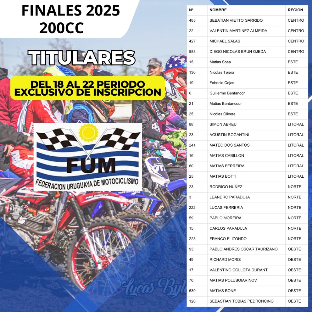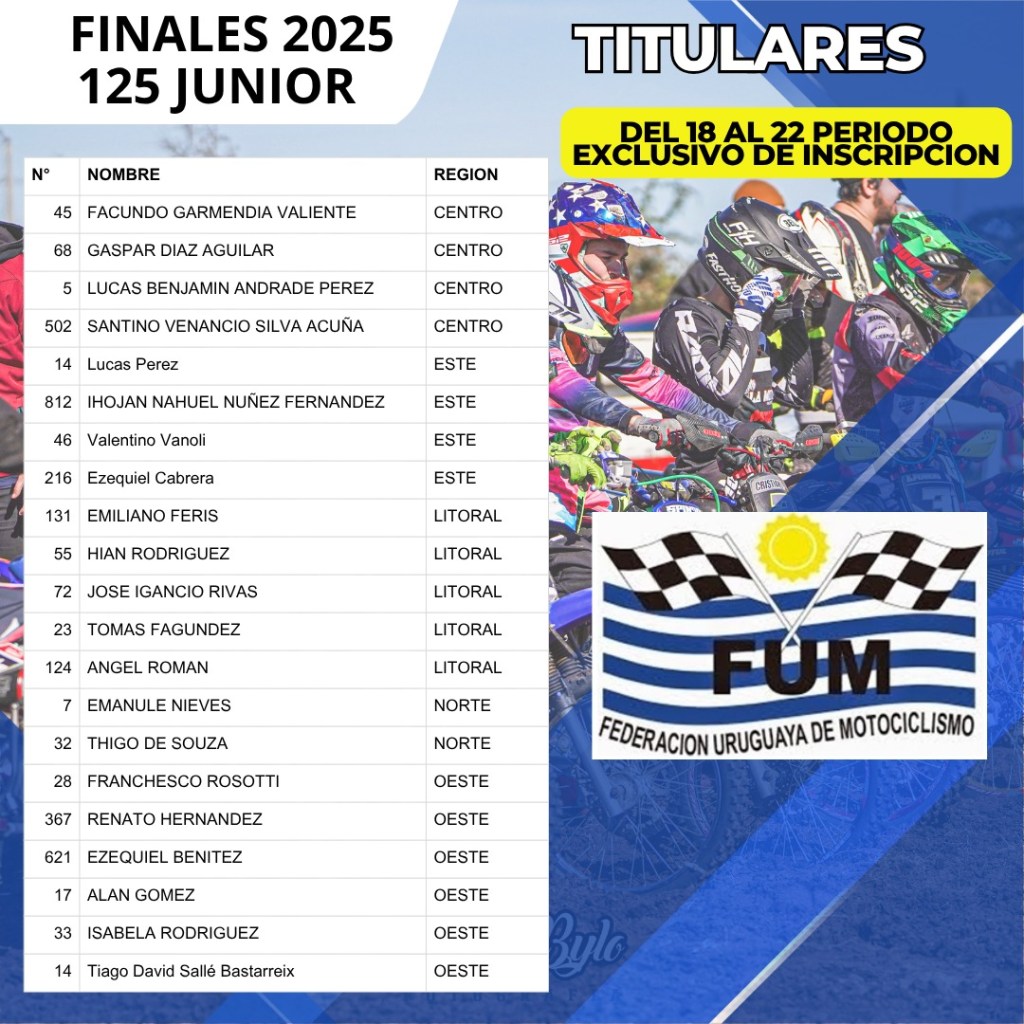 Los pilotos titulares son los seis primeros de los campeonatos de las 12 categorías en los cinco regionales del país: Suroeste, Sureste, Centro, Litoral y Norte. En las Finales Nacionales, ellos tiene prioridad a la hora de inscribirse, ya que se abre un período exclusivo que va del 18 al 22 de noviembre. Luego, lo pueden hacer del 23 al 26 de ese mes, pero junto con los suplentes.