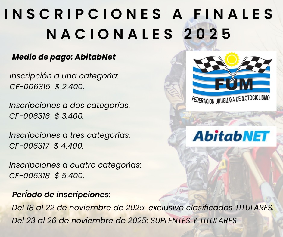 La inscripción a este evento, que es el que reúne a los mejores pilotos del país con más de 150 motos en pista, se hace a través de Abitab Net, como ya es costumbre. Allí se debe especificar nombre, cédula y las categorías en la que el piloto va correr, ya que cambian los precios si es una, dos, tres o cuatro.